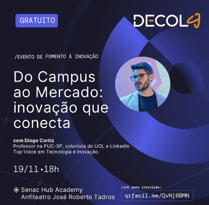 No dia 19, o circuito segue para o Senac Hub Academy, com atividades no período da manhã, no Auditório do Senac Turismo e Gastronomia, e à noite, no Anfiteatro José Roberto Tadros, com capacidade para 400 pessoas. O encerramento contará com palestras e painéis sobre inovação aplicada, empreendedorismo e transformação digital, com destaque para a participação do professor e pesquisador Diogo Cortiz (PUC-SP), especialista em tecnologias emergentes e comportamento digital.